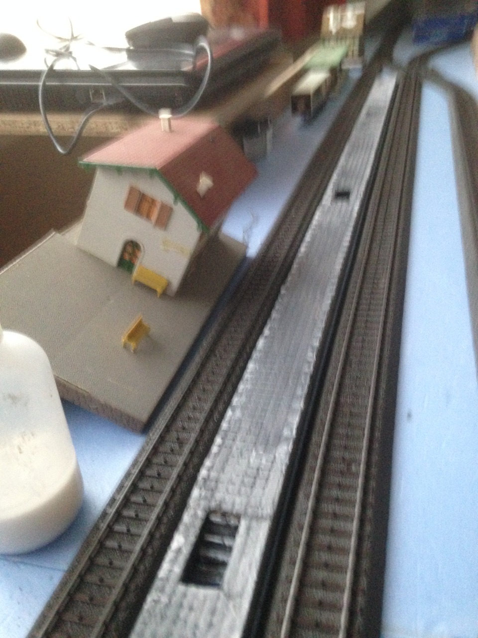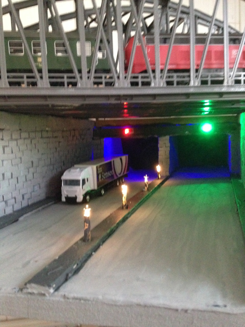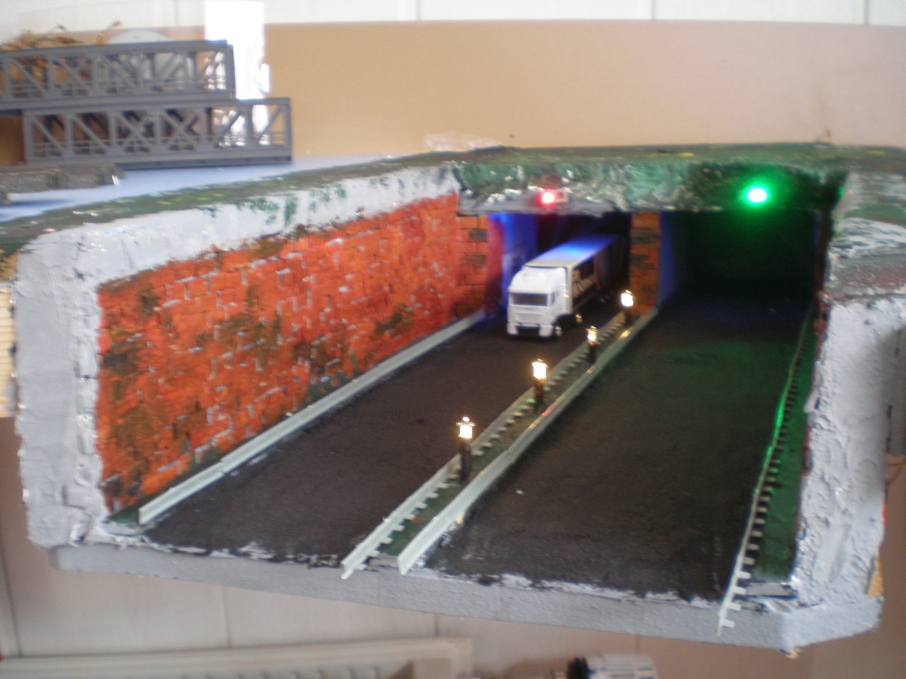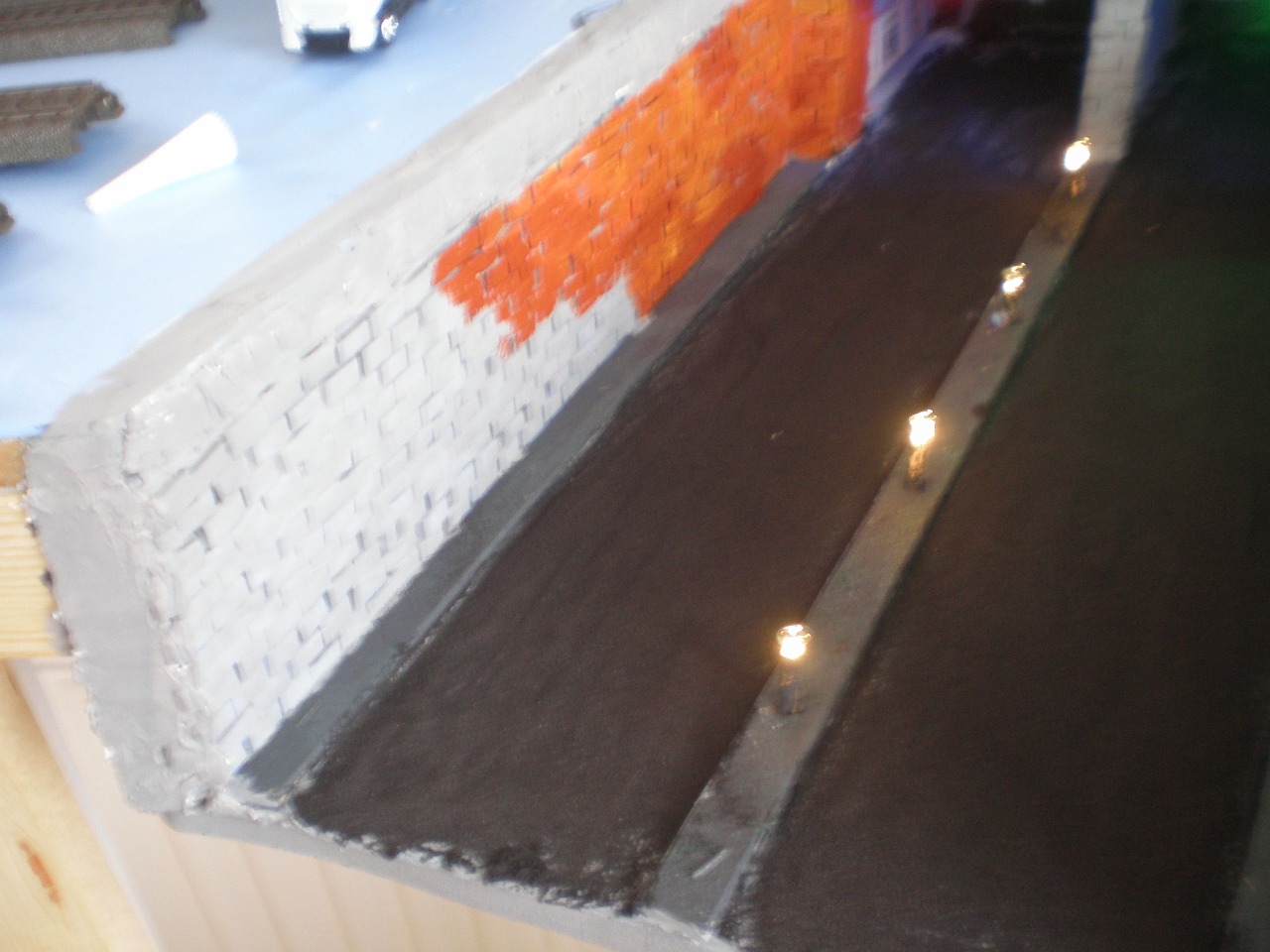 Verder met de tunnel. Het wegdek eerst ingesmeerd met verdunde houtlijm en deze voorzichtig bestrooid met asvalt korrels. In eerste instantie zag het er niet uit, overal blazen en korrels, maar het droogde toch redelijk strak op. De zijwanden heb ik in een steenkleur beschilderd, gewoon een beetje zwart/rood/bruin en wit doorelkaar , lekker kliederen.