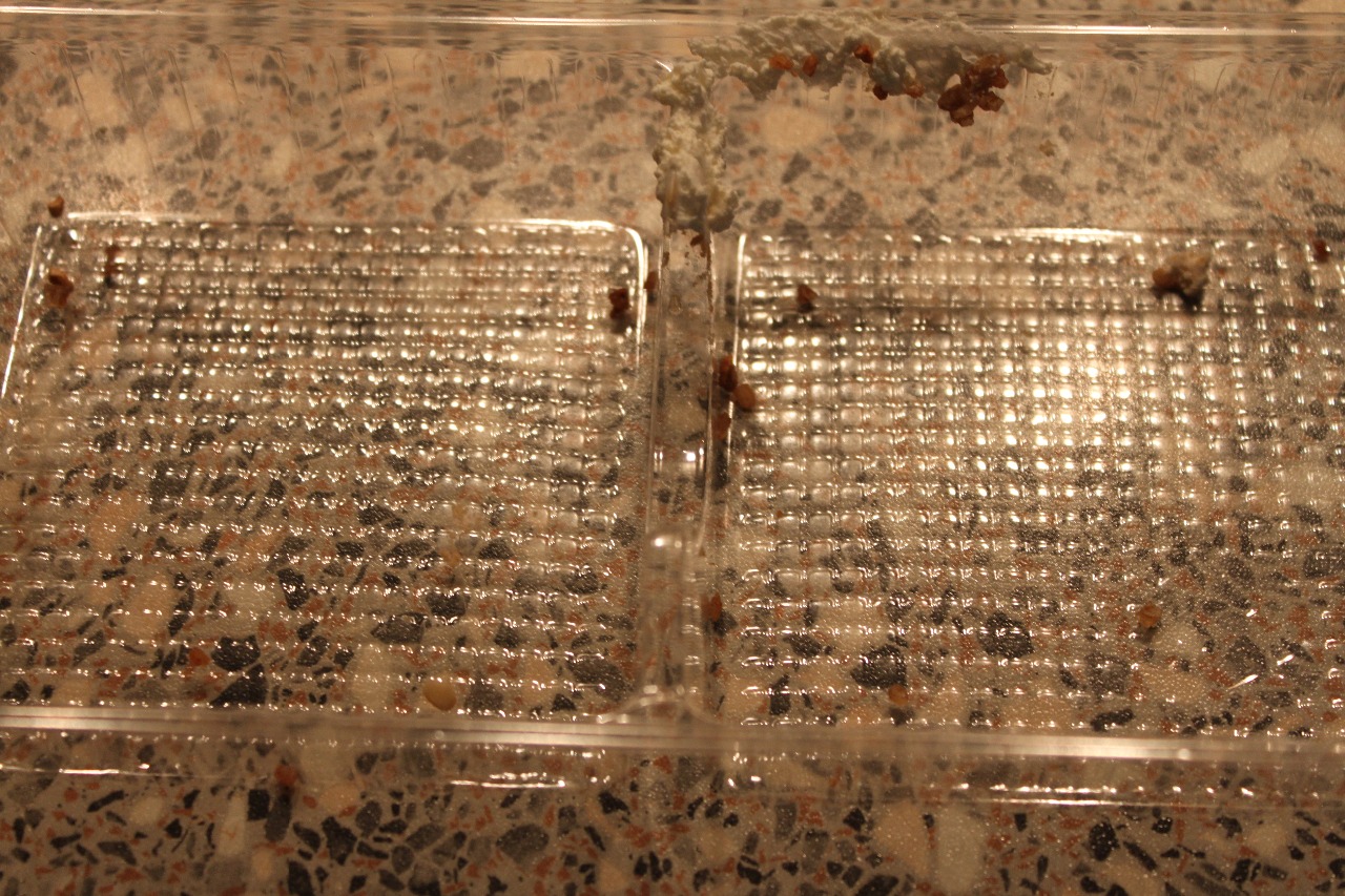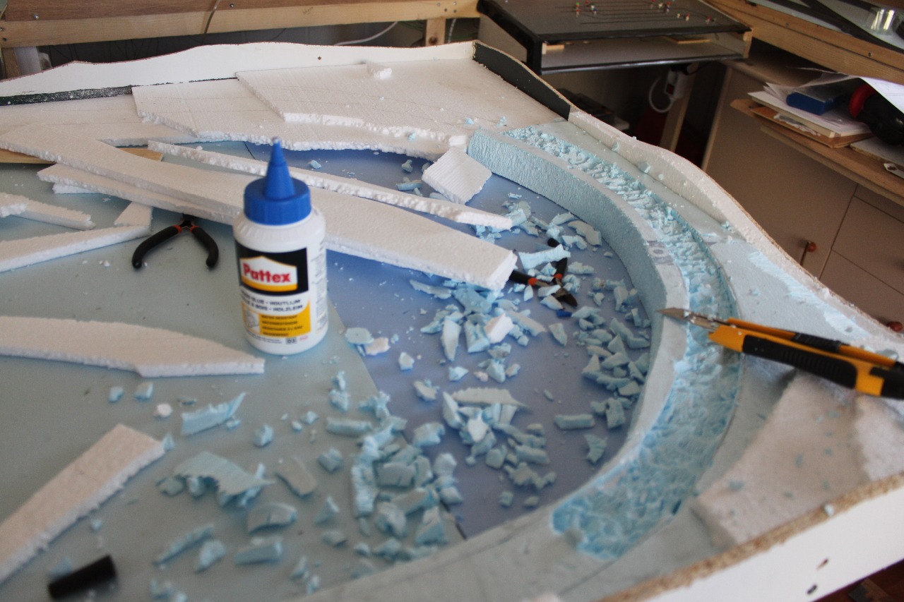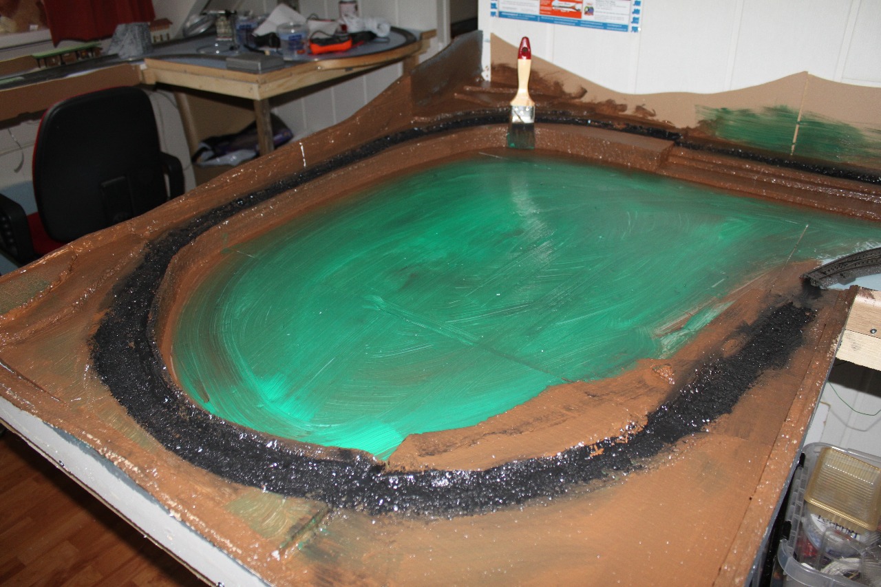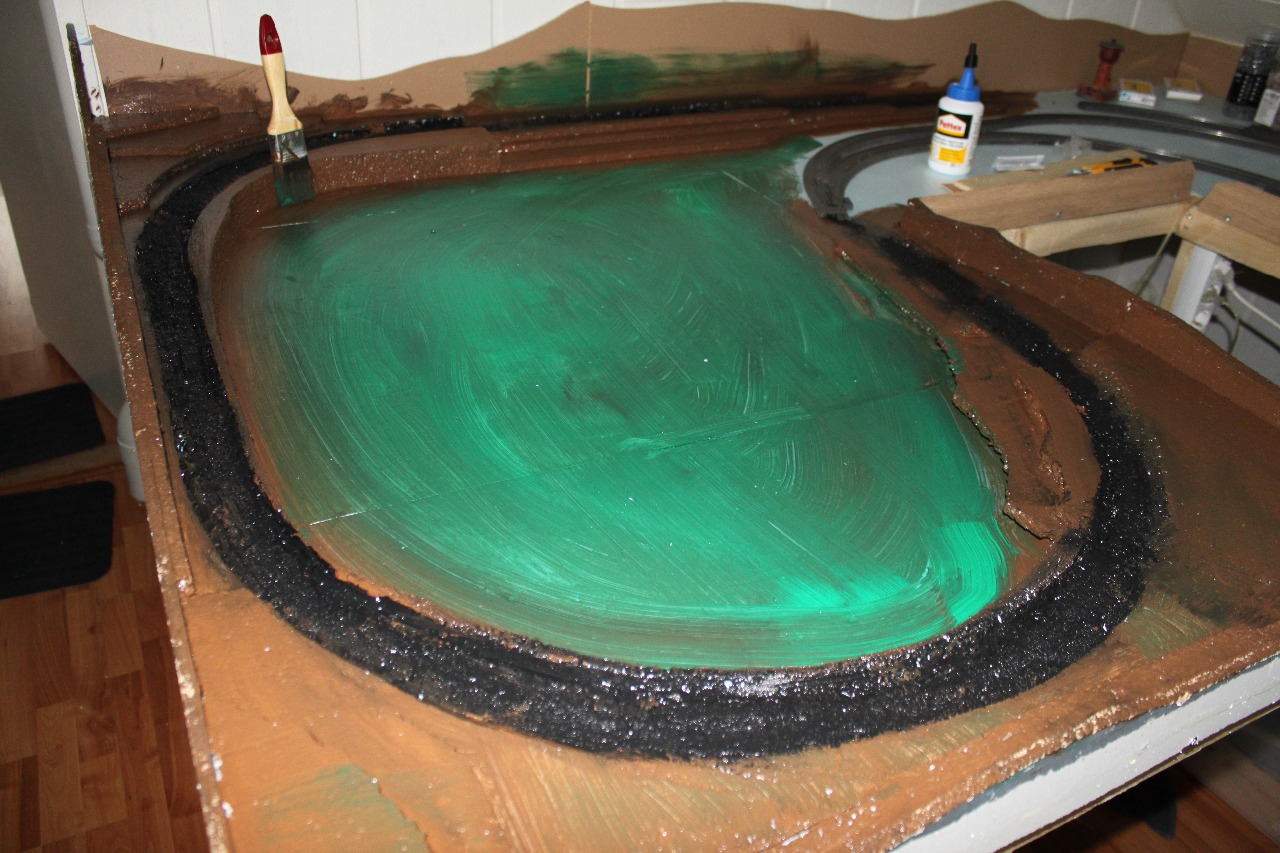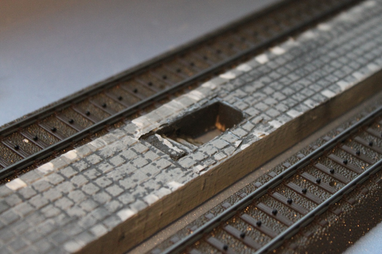 Verder met de tunnel. Het wegdek eerst ingesmeerd met verdunde houtlijm en deze voorzichtig bestrooid met asvalt korrels. In eerste instantie zag het er niet uit, overal blazen en korrels, maar het droogde toch redelijk strak op. De zijwanden heb ik in een steenkleur beschilderd, gewoon een beetje zwart/rood/bruin en wit doorelkaar , lekker kliederen.