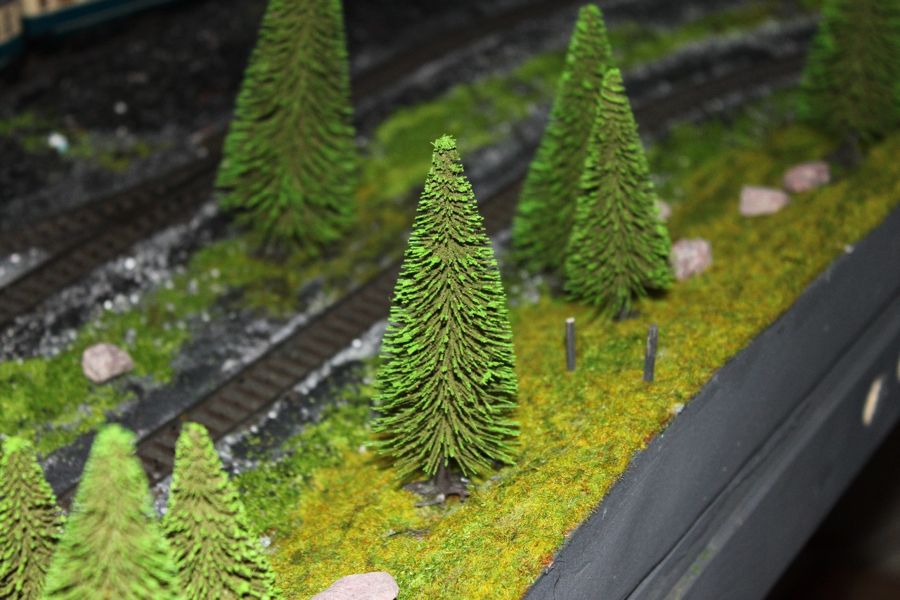 De boompjes heb ik (probeersel) van uitgebloeide begonia's bloemen gemaakt, de takjes eerst met kleurloze vernis ingespoten en de kruinen komen van groen kerst matriaal. Een eerste stukje landschap krijgt wat vorm......